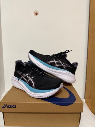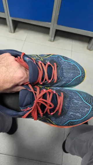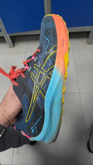 Zapatillas deportivas ASICS para running con un diseño moderno y llamativo. - Parte superior de malla transpirable. - Mediasuela con tecnología FFBlastMAX. - Detalles en color azul y naranja. Solo tienen un uso, pocos kilometros. Me las han regalado y me queda algo ajustadas. No negociable
