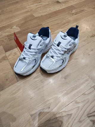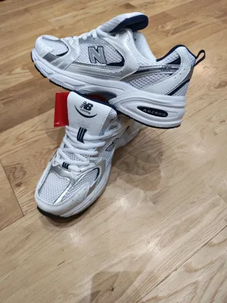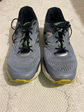 Zapatillas deportivas New Balance en tonos plata y blanco, perfectas para correr. - Diseño deportivo. - Detalles en malla transpirable. - Suela con tecnología ABZORB.