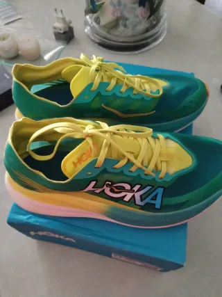Zapatillas de running Hoka Rocket 2 en llamativos tonos verde y amarillo. Diseñadas para ofrecer comodidad y rendimiento. - Parte superior de malla transpirable. - Suela con amortiguación. - Cierre de cordones.