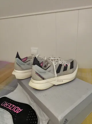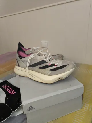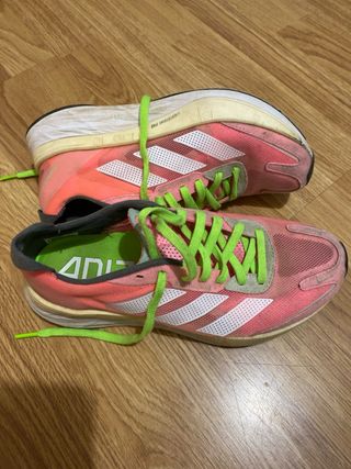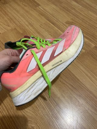 Zapatillas de running Adidas Adizero Adios Pro 3 en color gris con detalles en rosa. Diseñadas para ofrecer un rendimiento óptimo en carrera. Suele algo desgastada pero todavía con muchos kilómetros por hacer. - Parte superior de malla transpirable. - Amortiguación reactiva. - Suela de goma para un agarre duradero.