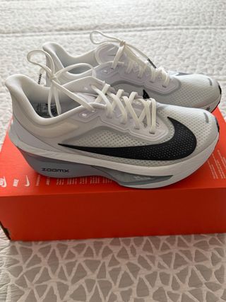 Zapatillas de running Nike Flyknit 6 en color gris y blanco. Diseñadas para ofrecer comodidad y rendimiento. - Parte superior de malla transpirable. - Suela con tecnología ZoomX para una amortiguación reactiva. - Cierre de cordones para un ajuste seguro.