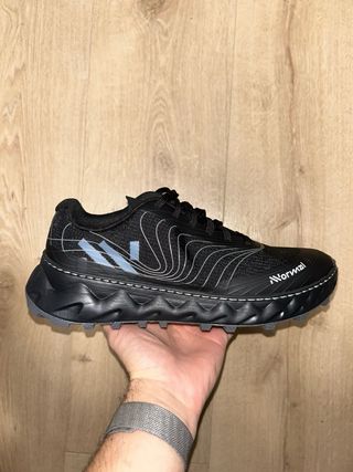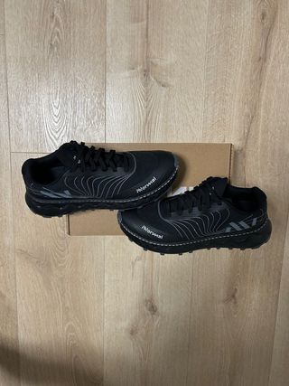 Zapatillas de trail running Nnormal Tomir 2.0 en color negro. Diseñadas para ofrecer rendimiento y comodidad en terrenos irregulares. - Parte superior de malla transpirable. - Suela de goma con buen agarre. - Cierre de cordones. - Detalle de líneas plateadas en los laterales.