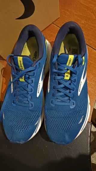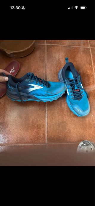 Zapatillas de trail running Brooks Cascadia 16 en tonos azules y negros. Diseñadas para ofrecer comodidad y rendimiento en terrenos irregulares. - Parte superior de malla transpirable. - Suela de goma con buen agarre. - Cierre de cordones. - Detalle de logo en el lateral. Tallan poco, yo uso un 43.5