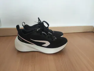 Zapatillas de running para mujer, modelo Kiprun 500. - Diseño en color negro con detalles en rosa. - Suela blanca con amortiguación. - Tejido de malla transpirable. Están nuevas, me las he puesto dos veces, pero soy una genia y no me compré la talla adecuada. Como le quité la etiqueta no las puedo devolver.