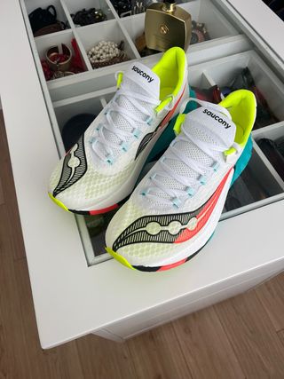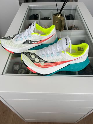 Zapatillas de running Saucony Endorphin con un diseño llamativo. - Parte superior de malla transpirable. - Detalles en color amarillo neón. - Suela con amortiguación. - Cierre de cordones.