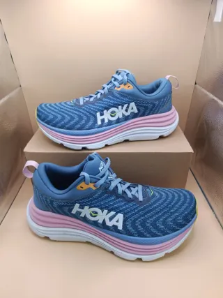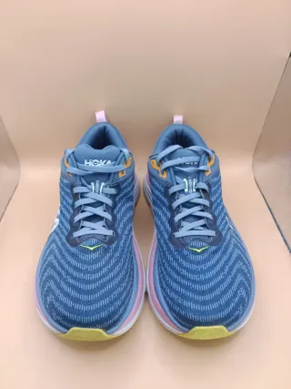 Zapatillas deportivas Hoka Gaviota 5 en tonos azules y rosados. En perfecto estado ✅ Talla 41 📏 Envío rápido 🚄 y bien empaquetado 🚛 - Diseño moderno con detalles en amarillo. - Suela blanca y rosa. - Parte superior de malla transpirable.