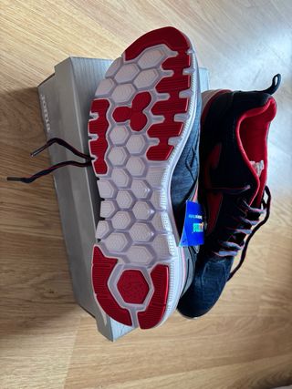 Zapatillas deportivas Under Armour con un diseño moderno. - Parte superior de malla transpirable. - Detalle de logo en color rojo. - Suela de goma para mayor tracción. - Poco uso. Como nuevas.