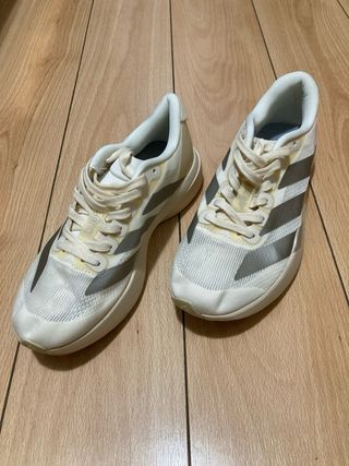 Zapatillas deportivas Adidas Adizero SL en tonos beige y plateado. Diseño moderno y ligero. - Parte superior de malla transpirable. - Detalle de las tres rayas plateadas. - Suela con tecnología Lightstrike Pro.