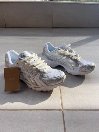 Zapatillas deportivas Asics Kayano 14 en tonos grises y plateados. Un diseño moderno y cómodo. - Parte superior de malla transpirable. - Detalles sintéticos. - Cierre de cordones.