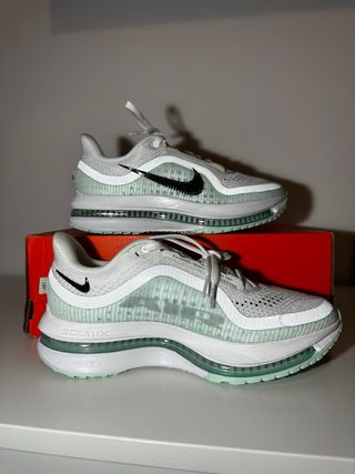 Zapatillas Nike Pegasus Premium en tonos grises y verdes. Diseño moderno y deportivo. - Parte superior de malla transpirable. - Detalle de Swoosh en negro. - Suela con amortiguación visible.