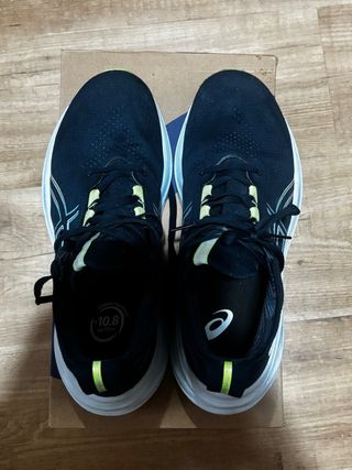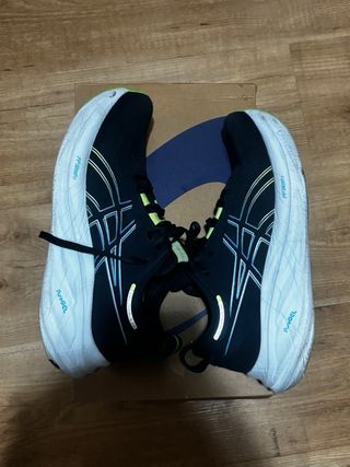 Zapatillas deportivas Asics Novablast 3 en color azul y naranja. - Parte superior de malla transpirable. - Mediasuela con amortiguación. - Suela de goma duradera. Me las han regalado pero por desgracia solo las he podido utilizar un par de veces. Por mi tipo de pisada no puedo usar zapatillas con tanto foam