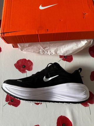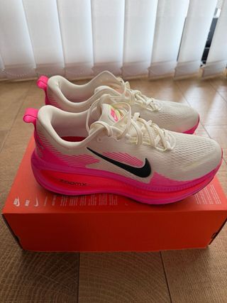 Zapatillas deportivas Nike Vomero 18 en talla 43. Diseñadas con una combinación de blanco y detalles en rosa vibrante. NUEVA a estrenar. Caja sin tapadera. Ticket de compra demostrable. - Parte superior de malla transpirable. - Suela con tecnología ZoomX para una amortiguación reactiva. - Detalle de Swoosh en negro. - Tirador en el talón para facilitar su colocación.
