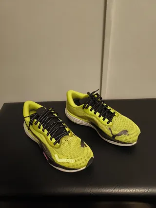 Zapatilla New Balance 1400, color amarillo y rojo. Ideal para carreras de 5.000 a 10.000. Ideal para distancias cortas. Muy ligeras. Peso: 175 g cada una. Están prácticamente nuevas. Solo las he usado dos días en pista y no me acostumbro a ellas. Nunca usadas en asfalto. - Parte superior de malla transpirable. - Detalles en color naranja y azul marino. - Suela de goma para tracción.