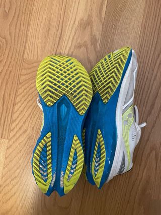 Zapatillas de running Hoka Carbon X en llamativo color amarillo. Diseñadas para ofrecer un rendimiento excepcional. - Parte superior de malla transpirable. - Entresuela de espuma CMEVA. - Suela de goma duradera. - Cierre de cordones. Aunque pone 46 encaja perfecto en un 45 o 45/5. Excepto en estas en todos mis otros modelos tengo un 45.
