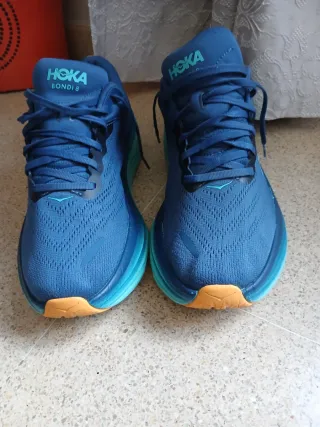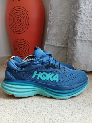 Zapatillas Hoka Bondi 8 en tonos azules y verdes. Diseñadas para ofrecer comodidad y amortiguación. - Parte superior de malla transpirable. - Entresuela con gran amortiguación. - Suela de goma duradera.