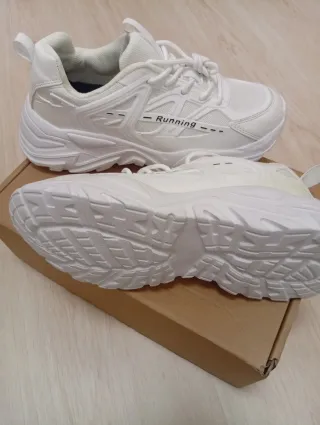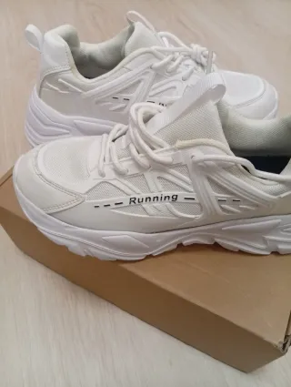Zapatillas deportivas blancas, de estilo running/casual, completamente nuevas y sin usar, aún con bolsa original. Diseño moderno y minimalista, ideales tanto para el día a día como para caminar o entrenar ligero. Cuentan con: Parte superior de tejido transpirable tipo knit Suela gruesa y ligera con buen agarre Cierre con cordones Muy cómodas y versátiles, combinan con todo Perfectas si buscas unas zapatillas blancas sencillas, cómodas y actuales. EU 44 (visible en la etiqueta) Material Exterior: Textil / malla transpirable Interior: Textil Suela: Goma / material sintético