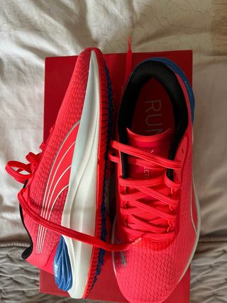 Zapatillas deportivas Puma Electrify Nitro 3 en llamativos tonos rojos y azules. Diseñadas para ofrecer comodidad y rendimiento. - Parte superior de malla transpirable. - Mediasuela con tecnología NITRO+. - Suela de goma para mayor tracción.