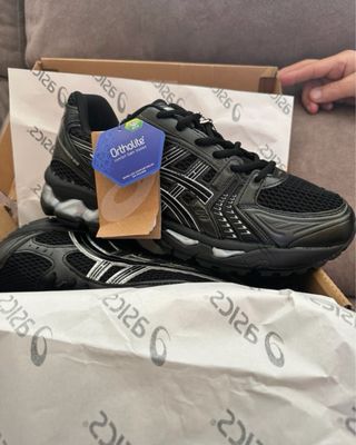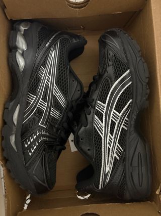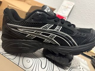 Zapatillas deportivas ASICS GEL-KAYANO 14 en color negro y plata. Diseño moderno y cómodo. - Malla transpirable en el empeine. - Detalle de líneas plateadas en los laterales. - Suela con tecnología GEL para amortiguación. Talla 40 NEGOCIABLE