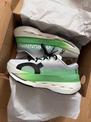 Zapatillas ON Cloudboon Max Talla EU 43 / US 9.5 Amortiguacion CloudTec lo que favorece la velocidad y la hiperespuma Helion para mayor retorno de la energia y comodidad Estilo de pisada rapida en asfalto Drop de 8mm Peso 296g ideal para distancias largas como la maratón Speesboard con fibra de vidrio Malla ligera y transpirable Nuevas sin estrenar Se envia en caja original Tallaje estandar Envio rapido Coste original de 240 euros