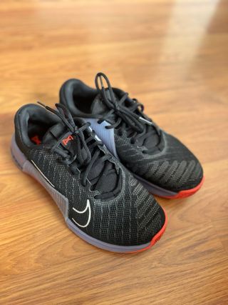 Zapatillas deportivas Nike Metcon en color negro y morado. - Diseño moderno y funcional. - Parte superior de malla transpirable. - Suela con agarre para mayor estabilidad. Falta etiqueta talla en una de las zapatillas.