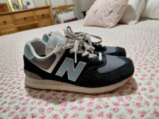 Zapatillas deportivas New Balance modelo 574. Combinan tonos negros y azules con detalles en gris y blanco. Se han usado pero están bien conservadas. - Diseño clásico de la marca. - Paneles de ante y malla. - Logo 'N' lateral en azul claro. - Suela ENCAP.