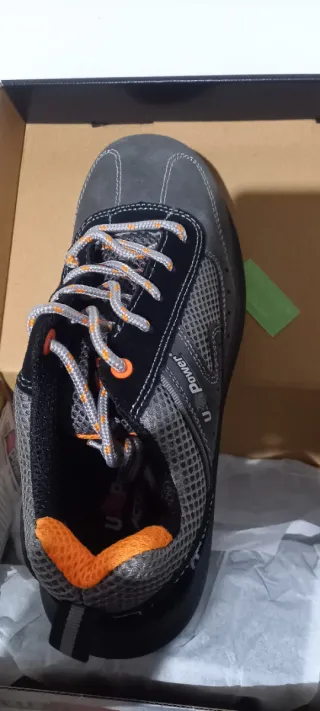 Calzado de seguridad UP Power con un diseño moderno y funcional. - Combinación de malla transpirable y ante. - Cordones grises con detalles naranjas. - Acolchado interior naranja en el cuello.