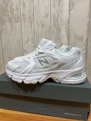 Zapatillas New Balance 530 en color blanco, talla 37. Vienen con su caja original. - Diseño deportivo y moderno. - Materiales de malla y sintéticos. - Suela con tecnología ABZORB.