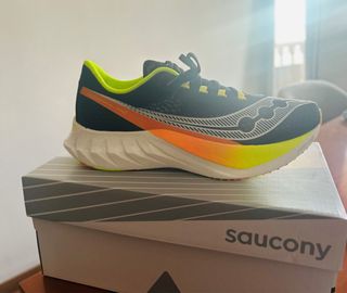 Zapatillas de running Saucony Endorphin Pro 3 en color amarillo y negro. Diseñadas para ofrecer un rendimiento óptimo en cada carrera. Me las puse una mañana y me sran grandes - Parte superior de malla transpirable. - Mediasuela con espuma PWRRUN PB. - Placa de nylon. - Suela de goma duradera.