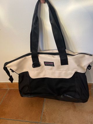 Bolso de la marca MYCARE beige y negro. - Asa larga para llevar al hombro. - Compartimento principal con cierre de cremallera. - Bolsillo frontal con malla y pequeño bolsillo exterior con cremallera. 60 cm ancho x 35 cm alto.