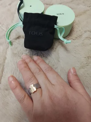 Anillo de la marca Tous con diseño de oso. - Combina oro y plata. - Estilo malla.