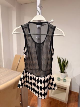 Top de mujer con un llamativo estampado de rombos en blanco y negro. Presenta detalles de malla transparente en el escote y la cintura. - Diseño sin mangas. - Corte peplum. - Tejido elástico.