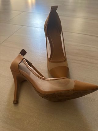 Zapatos de tacón malla y piel color camel