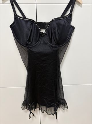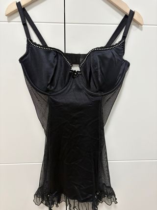Elegante combinación de lencería con detalles de pedrería y malla. - Copas con relleno y aro. - Tirantes ajustables. - Adorno de pedrería en el escote. - Panel frontal de satén. - Laterales y parte inferior de malla. - Detalle de volantes en el bajo.