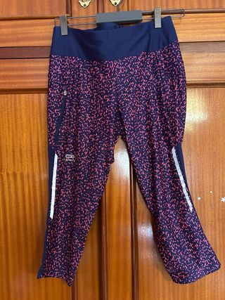 Mallas piratas deportivas con un diseño estampado en azul marino y rosa. Perfectas para actividades deportivas. - Cintura elástica. - Bolsillo lateral con cremallera. - Detalles reflectantes en los laterales.