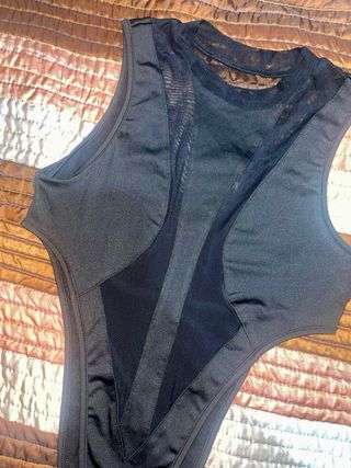 Body de color negro con un diseño moderno y atrevido. - Tejido principal opaco. - Paneles de malla en la parte delantera y trasera. - Escote redondo. - Abertura en la espalda. - Corte alto en las caderas.