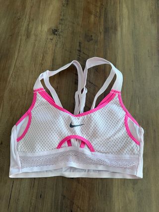 Sujetador deportivo Nike. Tejido principal de malla rosa claro. Con detalles en color rosa fucsia. Tirantes cruzados en la espalda. Se pueden retirar almohadillas
