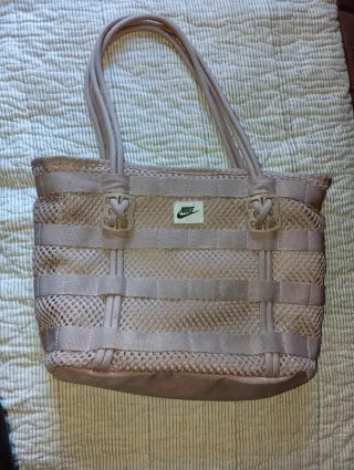 Bolso Nike en color beige rosado, con un diseño moderno y ligero. - Material exterior de malla transpirable. - Asas de hombro cómodas. - Cierre superior. - Detalle de cinchas y hebillas decorativas. Tiene algunas manchas de roce e interiores, se ven en las fotos, pero puesto no se aprecian.
