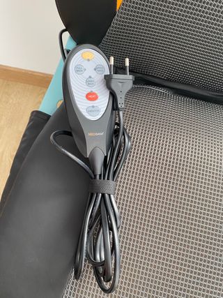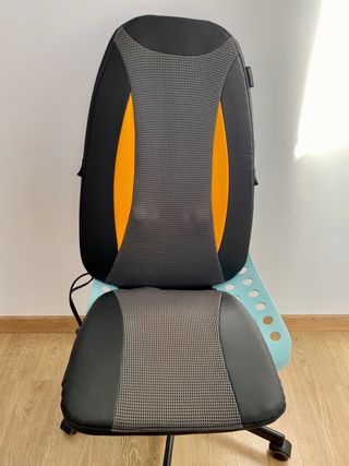 Respaldo de masaje con un diseño moderno y cómodo. - Panel central de malla gris. - Detalles en color naranja. - Acabado en cuero sintético negro.