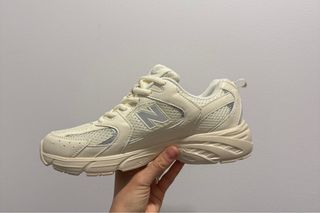 Zapatillas deportivas New Balance en color beige con detalles plateados. Diseño moderno y cómodo. - Parte superior de malla y sintético. - Logo de New Balance en el lateral. - Suela de goma para mayor tracción.