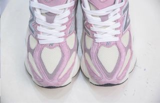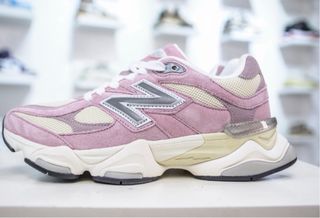 Zapatillas New Balance 9060 con una combinación de colores beige y rosa. - Diseño moderno y llamativo. - Materiales de ante y malla. - Detalle del logo 'N' en los laterales.