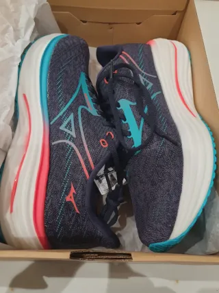 Zapatillas de running Mizuno Wave Rider 29, nuevas y sin usar. Diseñadas para ofrecer comodidad y rendimiento en cada carrera. - Parte superior de malla transpirable. - Amortiguación Wave para una pisada suave. - Detalles en color rosa y turquesa.