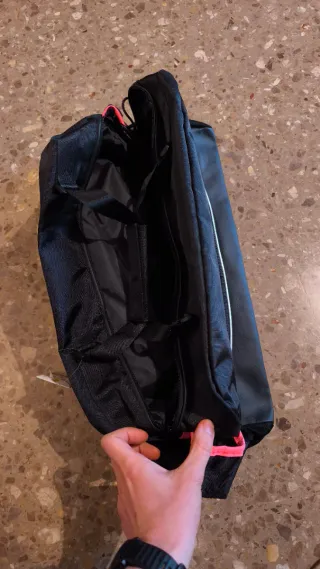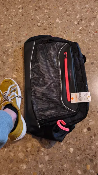 Práctica bolsa de deporte Oysho con un diseño moderno. Sin estrenar - Compartimento principal con cierre de cremallera. - Bolsillo frontal con cremallera y detalle en color rosa. - Malla transpirable en uno de los laterales. - Asa de mano y correa ajustable para el hombro.