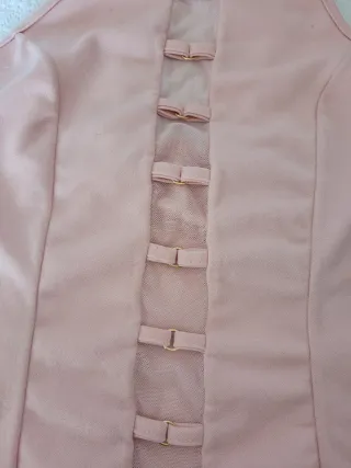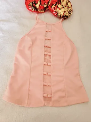 Prenda superior de color rosa con un diseño moderno y detalles delicados. - Panel central de malla. - Adornos tipo lazo con hebillas doradas. - De tirantes finos. - Elástico en ña parte de pa espalda para más sujeción.