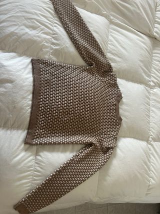 Jersey de punto con un diseño texturizado en tonos marrones y blancos. Es una prenda cómoda y versátil. - Diseño de tejido con patrón de rombos. - Manga larga. - Cuello redondo.largo 55 cm ancho 45 cm