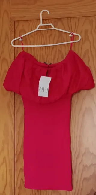 Vestido de Zara con un diseño moderno y llamativo. - Escote Bardot. - Volante en el escote. - Manga abullonada.