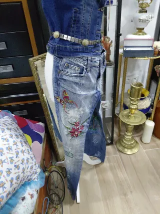 Pantalón vaquero de estilo desgastado con un bonito estampado floral y de mariposa. - Diseño con múltiples detalles bordados.