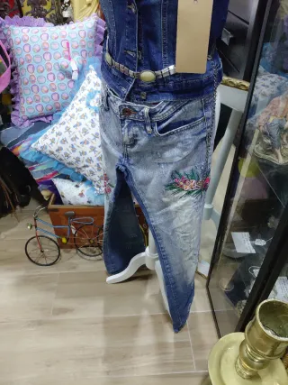 Chaleco vaquero para mujer, con un diseño moderno y versátil. - Detalle de flores bordadas en los bolsillos. - Cierre de botones. - Adornado con varios broches. - Cinturón incluido.
