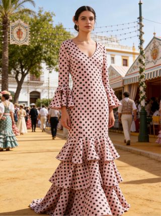 Vestido de inspiración flamenca, perfecto para ferias y romerías. Su diseño de lunares lo hace destacar. Talla S, M, L