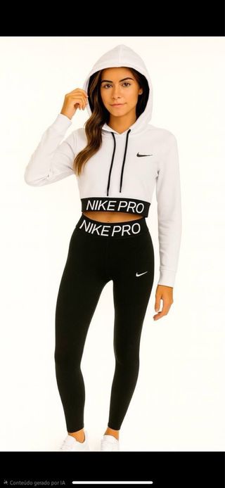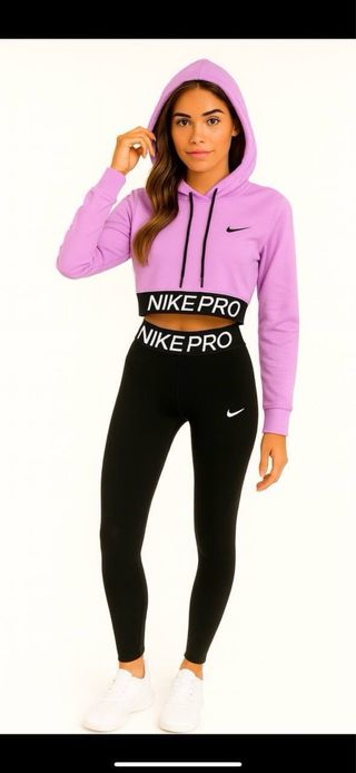 Conjunto deportivo de dos piezas de Nike. - Crop top con capucha y cordones. - Cintura ancha con logo. - Leggings ajustados. Tengo talla S L XL XXL