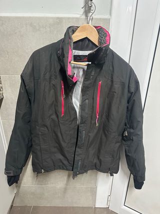 Chaqueta de esquí Eider en talla M, con detalles en color rosa. - Diseño moderno y funcional. - Cremalleras frontales y en bolsillos. - Cuello alto con forro interior. - Puños ajustables.